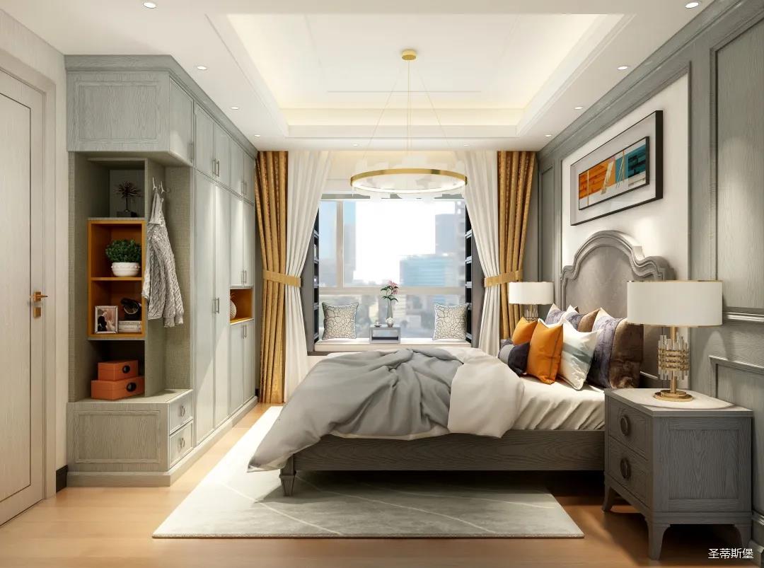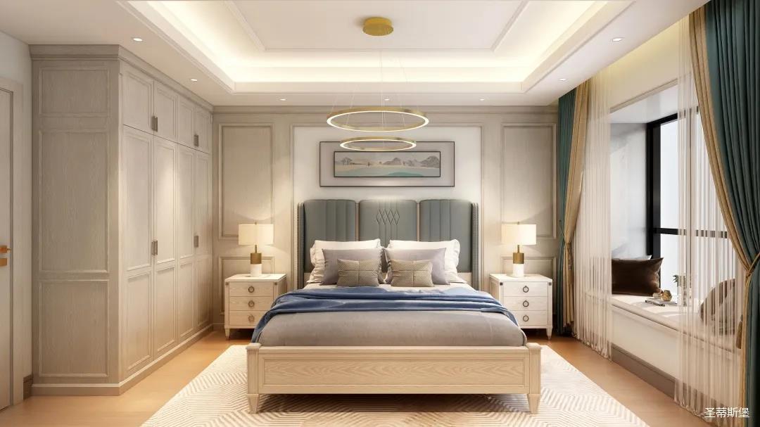 ▲业主喜欢低调轻奢的空间格调,设计师从功能出发,赋予空间舒适的感受,打造专属的衣帽间,满足业主日常买买买的储物喜好。同时也将艺术元素融入美式现代风格,利用空间的色彩、纹理、家具、配饰、光线等表达空间情绪,再以黄铜金属加持,营造温馨惬意的家居睡眠氛围。